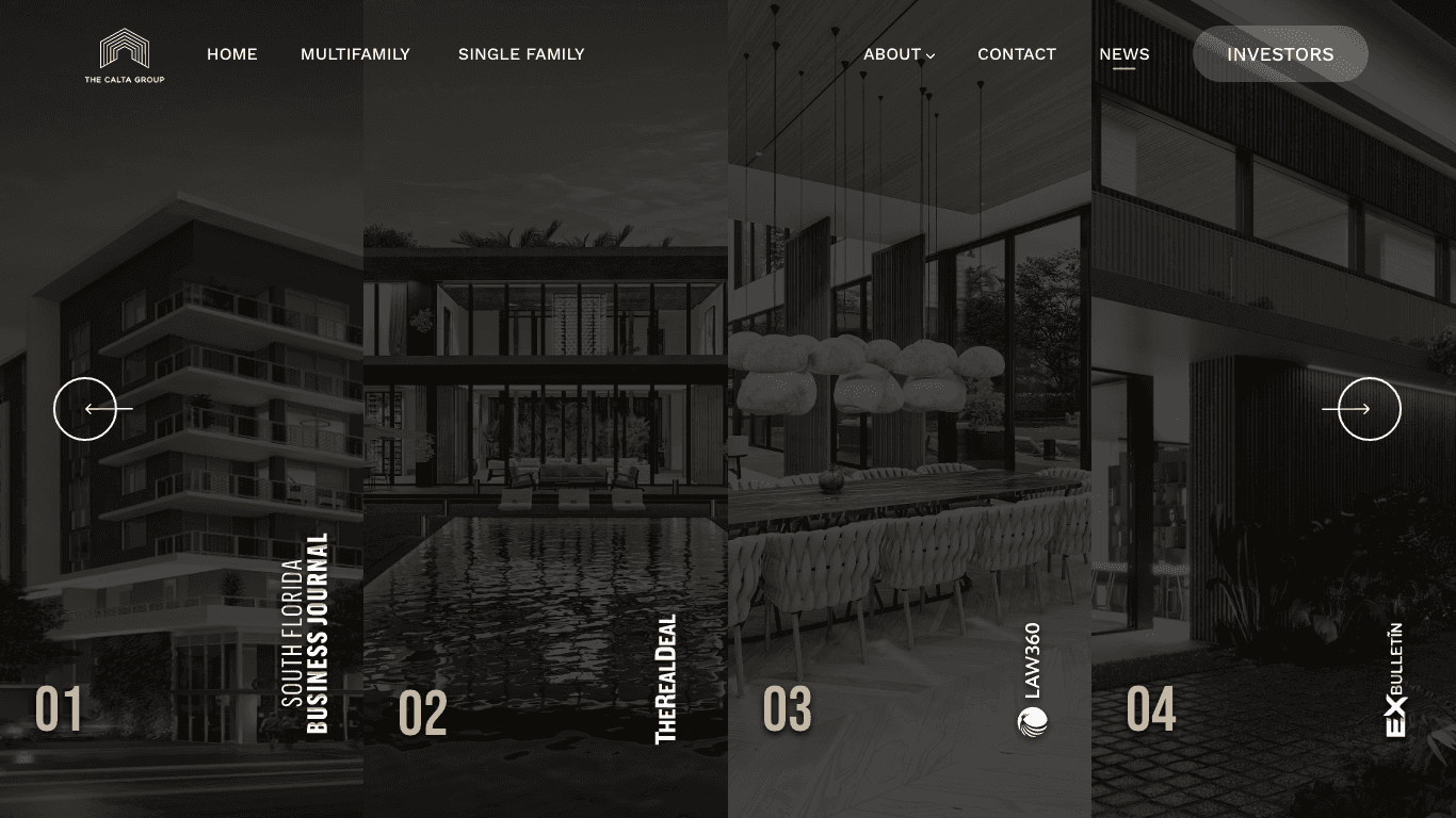 Calta Group is a distinguished luxury real estate developer known for crafting high-end residential properties across South Florida. The Calta Group has specialized in the development and construction of luxury residential real estate throughout South Florida. Our properties reflect sophistication in design and uphold the highest standards of execution and quality, ensuring an exceptional living experience. You can find Calta Group projects in the most sought-after areas, including Pinecrest, Coral Gables, South Miami, Coconut, and Miami Beach. This project focused on designing a premium digital platform that showcases these residences with clarity, elegance, and an immersive browsing experience tailored to luxury buyers.