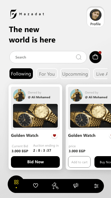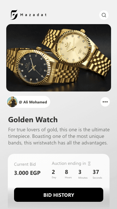 Mazadat was designed to deliver a premium digital auction experience tailored to high-end and luxury markets. The platform allows users to explore exclusive items, participate in competitive bidding, and monitor auctions in real time through a refined mobile interface. The project focused on building trust, clarity, and excitement within fast-paced auction flows while maintaining a sense of elegance and control. Special attention was given to item presentation, bidding feedback, and live updates. My role involved shaping the UX structure, defining interaction flows, and ensuring the experience supports confident decision-making in time-sensitive auction scenarios.