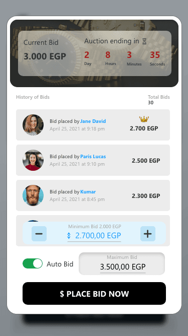 One of the main challenges was managing real-time bidding without creating confusion or anxiety for users. We addressed this by designing clear countdown timers, prominent bid indicators, and instant visual confirmation after each action. Another challenge involved establishing trust in high-value transactions, which we solved through transparent auction histories, clear item details, and consistent UI patterns. Balancing excitement with usability was also essential, requiring restrained animations and focused layouts. These solutions ensured users remain informed, confident, and engaged while participating in competitive luxury auctions.