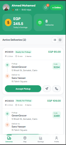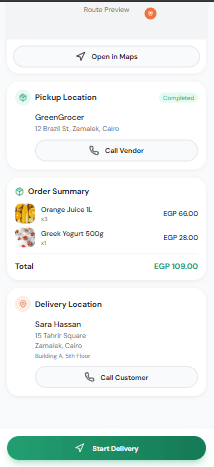A key challenge was balancing speed with accuracy in fast-paced delivery environments. We addressed this by minimizing screen complexity and displaying only essential information at each stage. Handling real-time order updates and changes was another challenge, solved through instant notifications and synchronized status updates. To prevent errors, we implemented confirmation states and clear system feedback. The design also considered varying technical skill levels among drivers, ensuring ease of use and quick onboarding.